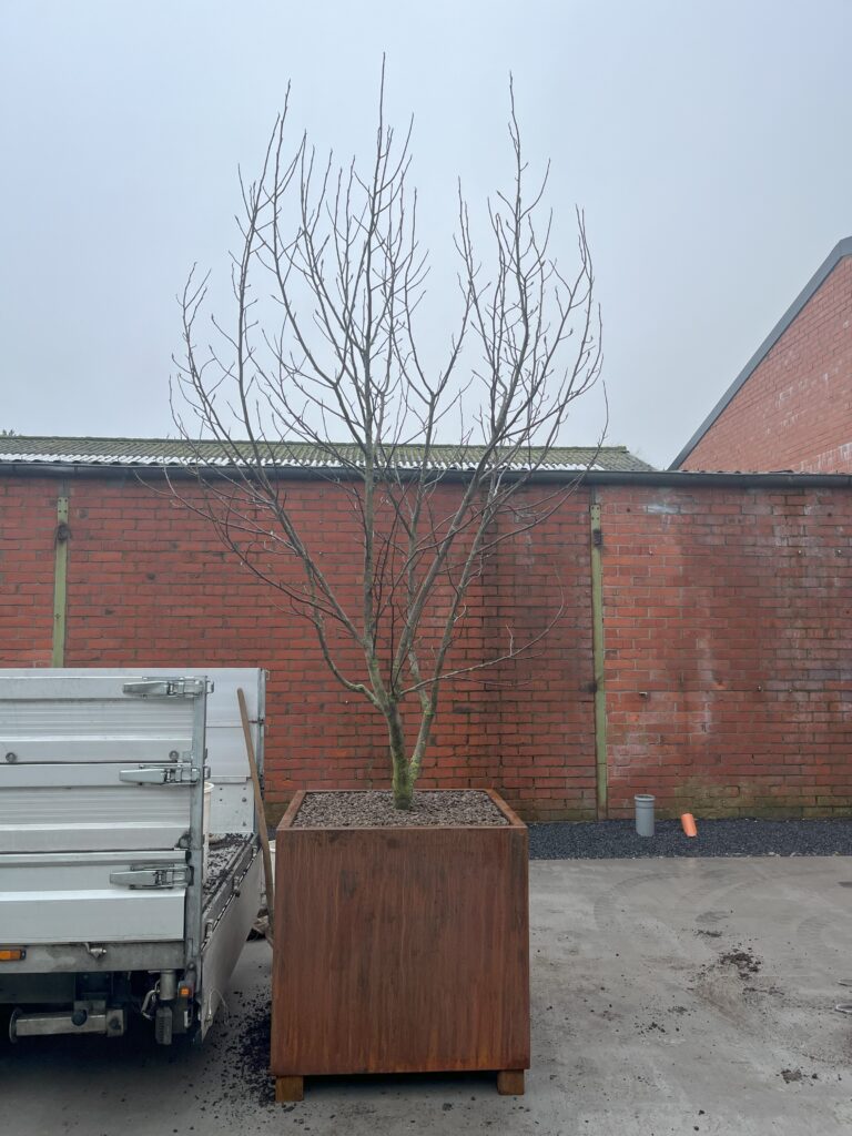 Aanplanten van een boom in een pot van cortenstaal